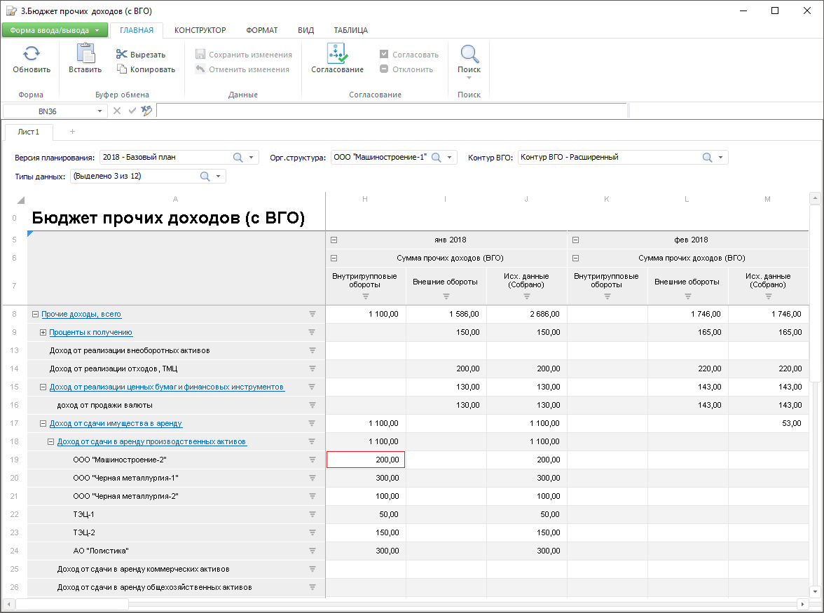 «Бюджет прочих доходов (с ВГО)», которая содержит данные компаний-арендодателей о доходах от сдачи в аренду производственных активов – по данным компании-арендодатель ООО «Машиностроение-1» её доход в январе 2018 от сдачи в аренду производственных активов компании ООО «Машиностроение-2» составил 200 тысяч рублей.