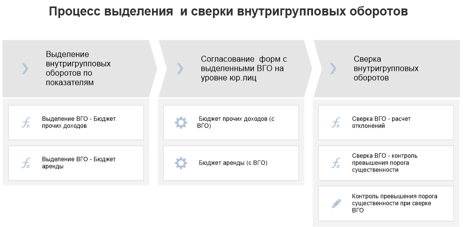 Далее для объединения результатов этих шагов в продукте «Форсайт. Бюджетирование» настраивается «Процесс выделения и сверки внутригрупповых оборотов», который запускается на уровне группы компаний: