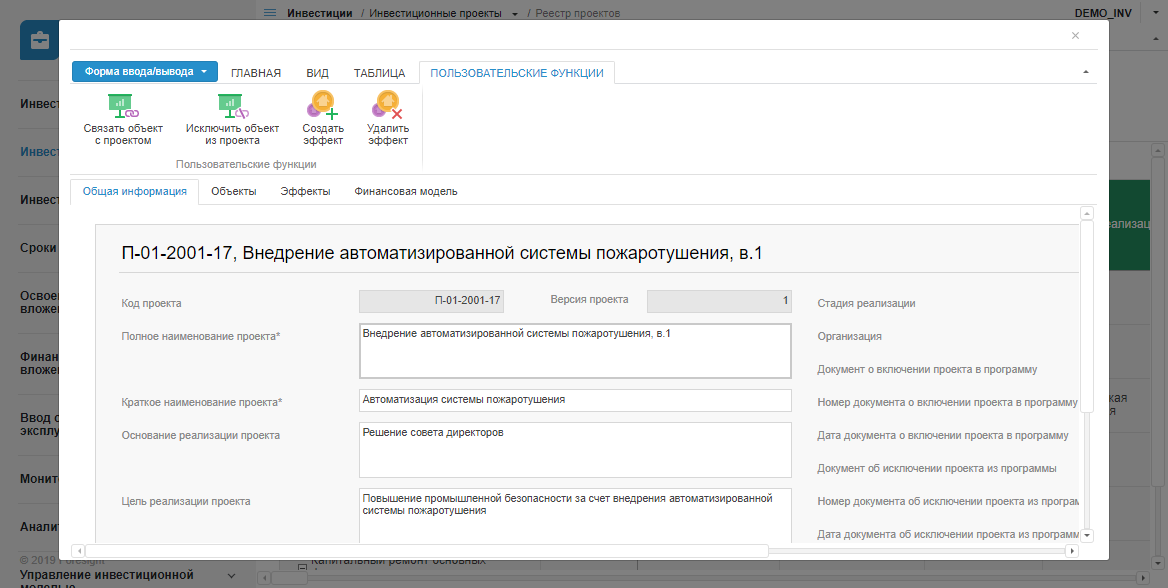 Паспорт инвестиционного проекта используется для ввода, просмотра и редактирования данных по получаемым эффектам от реализации включённых в него объектов инвестиций.