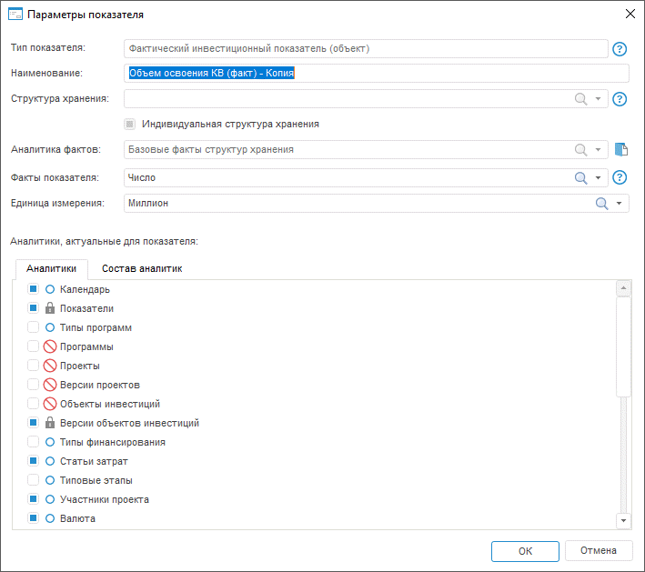 После создания инвестиционного показателя автоматически создаются структуры хранения данных для нового показателя.