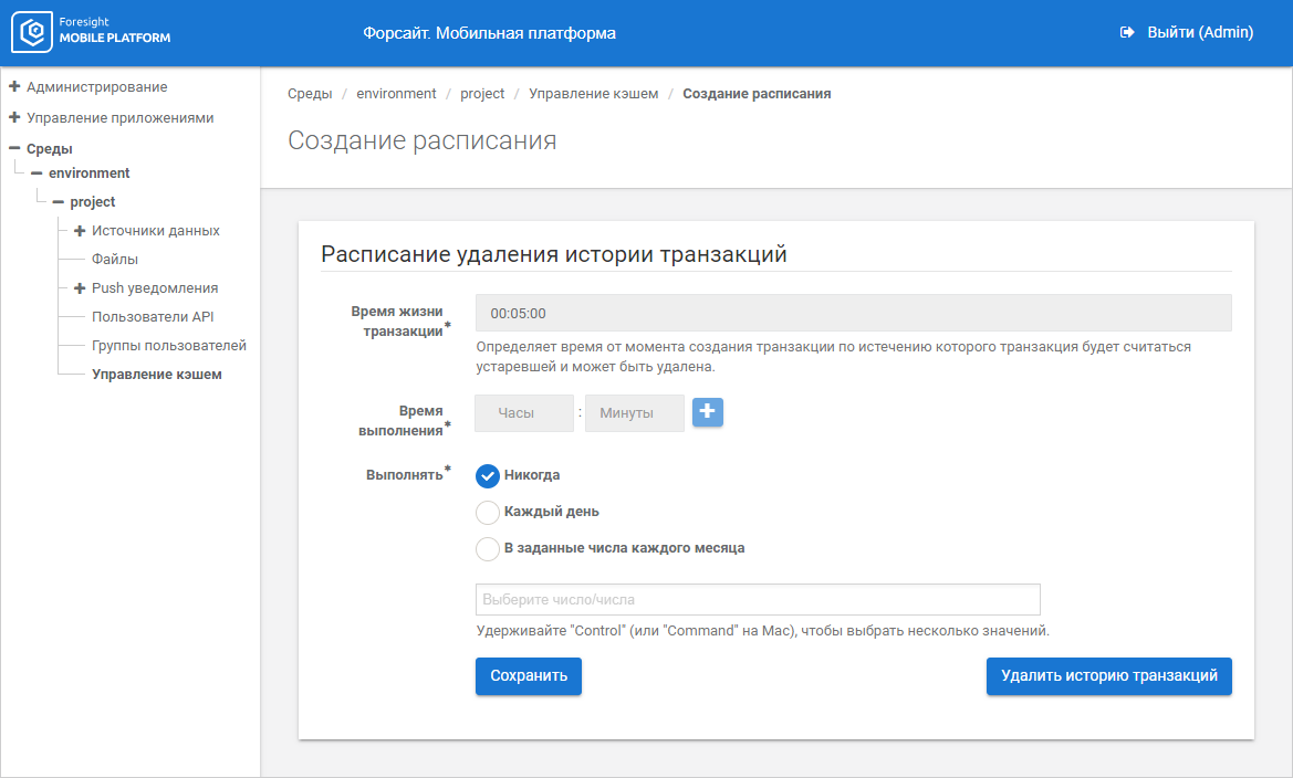 Удаление кэша с истёкшим сроком хранения. Для всех существующих кэшей задайте расписание удаления кэша с истёкшим сроком хранения, позволяющее избежать постоянного роста базы данных мобильной платформы. Срок актуальности кэша задается при импорте ресурса. Также удалить все устаревшие кэши можно вручную;