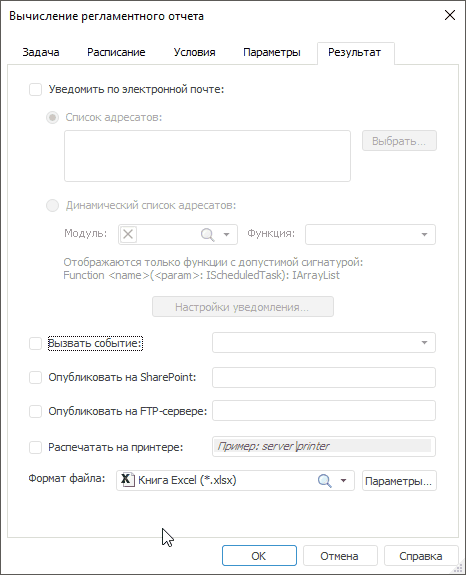 Примечание. Настройка расписания, условия и результата опциональна и может быть произведена в зависимости от требований задачи.