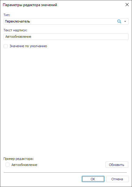 Значение по умолчанию. Определите значение, которое будет отображаться в редакторе по умолчанию. Данное значение должно быть в диапазоне допустимых значений, заданных для редактора. Если диапазон допустимых значений для редактора не задан, то значение должно быть в диапазоне [-5.0 x 10-324; 1.7 x 10308];