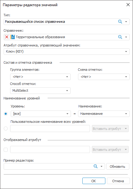 Справочник. В раскрывающемся списке выберите справочник, элементы которого будут отображаться в редакторе;