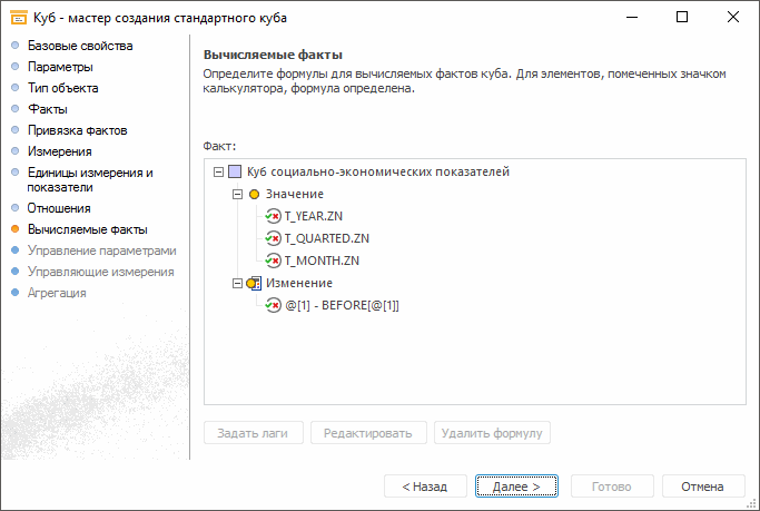 На странице «Вычисляемые факты» задаются формулы для вычисляемых фактов. Вычисляемый факт представляет собой функцию от значений других фактов, вычисляемых фактов или отношений.
