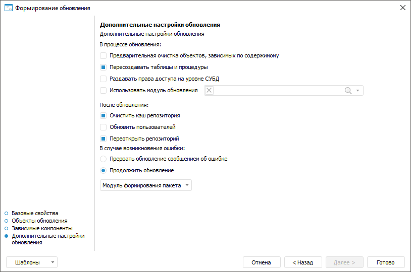 При необходимости настройки формирования обновлений возможно сохранить в шаблон в формате .XML для повторного использования. В шаблон сохраняются: наименование обновления, список всех объектов с установленным составом обновления и состояние отметки (флажок установлен /не установлен), дополнительные настройки. В шаблон не сохраняется состояние отметки по обновлению зависимых компонентов, флажки установлены всегда по умолчанию. Нажмите на кнопку «Шаблоны» и выберите из списка один из вариантов: