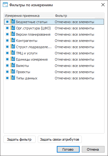 задайте фильтрацию измерений по связям атрибутов. Нажмите кнопку «Задать связи атрибутов». Будет открыт диалог «Фильтрация по связям атрибутов», в котором задайте настройки фильтрации. Для получения подробной информации обратитесь к статье «Настройка фильтрации по связям атрибутов».