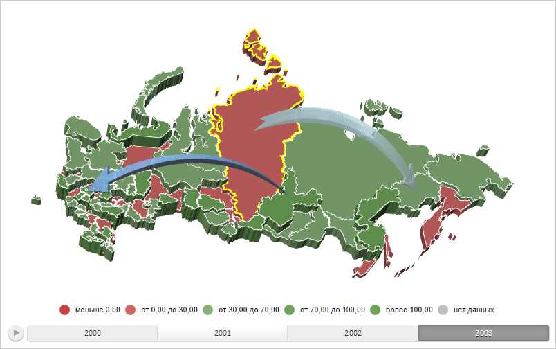 В результате выполнения примера для области слоя трёхмерной карты с идентификатором «RU-KYA» были установлены граница жёлтого цвета и толщина, равная 2 пикселям: