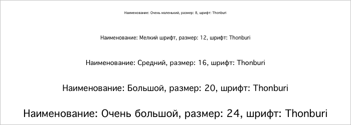 В результате выполнения примера на экране мобильного устройства были отображены метки, содержащие наименования размеров шрифтов, значения, соответствующие различным размерам шрифтов, а также наименования шрифтов, которые были использованы для отображения надписей меток: