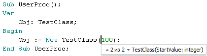 Для любого члена типа реализована всплывающая подсказка, содержащая синтаксис члена и список всех его обязательных и необязательных параметров. Данная подсказка выводится автоматически после указания открывающей круглой скобки после наименования члена типа. Параметр, значение которого редактируется в текущий момент, подсвечивается жирным шрифтом. После указания закрывающей круглой скобки всплывающая подсказка будет скрыта. Для вызова подсказки вручную используется сочетание клавиш CTRL+SHIFT+SPACE.