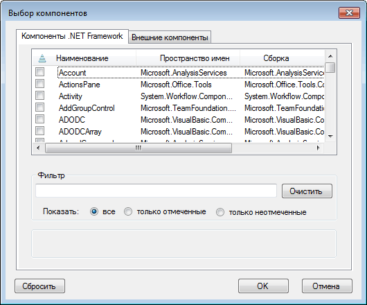 Для быстрого поиска необходимого компонента в диалоге организован фильтр. Фильтрация осуществляется по наименованию компонентов. После отметки необходимых компонентов и нажатия кнопки «OK» выбранные компоненты будут добавлены на вкладку. После этого компонент можно использовать в .NET-формах.