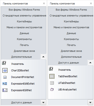 Панель компонентов .NET включает в себя вкладки с различными компонентами, используемыми при разработке .NET-форм. К ним относятся вкладки со стандартными компонентами Windows Forms, а также две вкладки с компонентами платформы, оптимизированными для использования на .NET-формах.