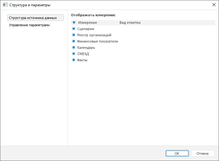 Настройка структуры источника данных экспресс-отчёта позволяет задать измерения, доступные для работы пользователю.
