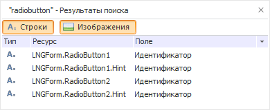 Для фильтрации результатов поиска используйте кнопки «Строки» и «Изображения». Если кнопка нажата, то соответствующие ресурсы отображаются в результатах поиска, если кнопка в ненажатом состоянии, то соответствующие ресурсы скрыты из результатов поиска.