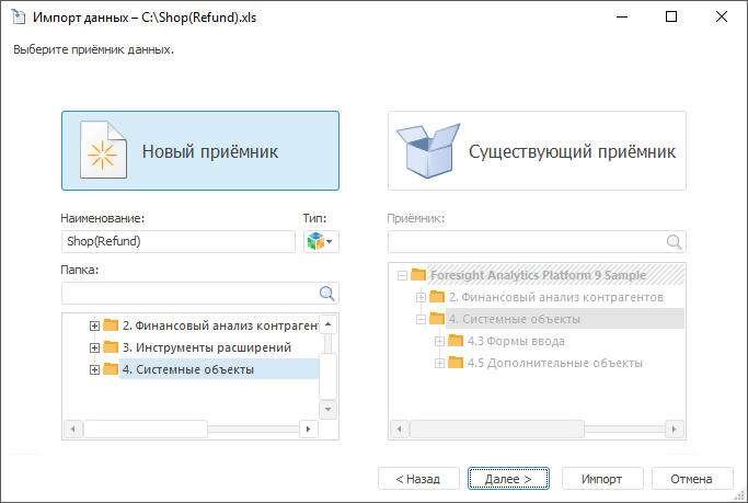 Нажмите кнопку «Новый приёмник», задайте наименование нового куба и выберите папку, в которой он будет сохранен в репозитории. Нажмите кнопку «Далее».