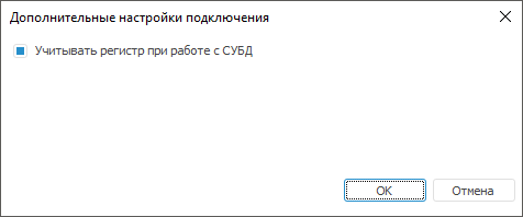 Окно с дополнительными настройками вызывается при нажатии соответствующей кнопки на странице «Свойства базы данных». В зависимости от типа СУБД набор дополнительных параметров будет разный.