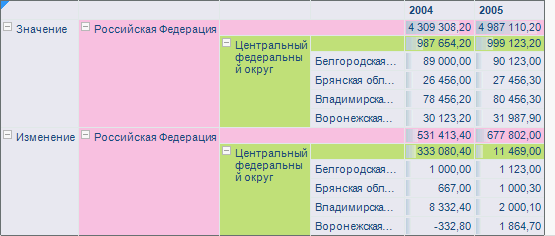 Рассмотрим область данных, для которой включено произвольное размещение, заданы дополнительные наименования элементов измерения, для заголовков и данных элементов заданы идентичные оформления:
