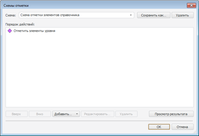 В открывшемся диалоговом окне «Схемы отметки» нажмите кнопку «Добавить» и выберите из раскрывающегося списка вариант «Отметить уровень». В список «Порядок действий» будет добавлен элемент «Отметить элементы уровня»: