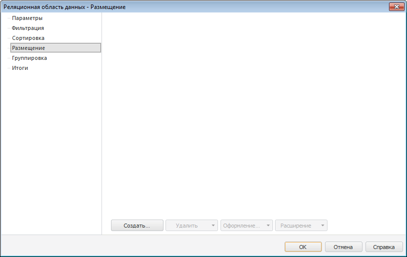 Для настройки структуры отображения реляционного источника на листе отчета перейдите на вкладку «Размещение» диалогового окна «Реляционная область данных»: