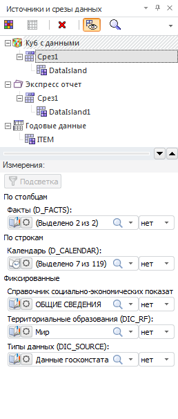 Примечание. Панель «Источники и срезы данных» является устаревшей и используется для совместимости с прошлыми версиями Prognoz Platform.