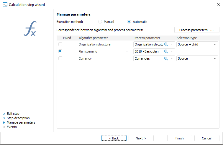 The calculation algorithm in the given example is started with fixed value of the Plan Version parameter: Year plan 2018. For fixed parameter value, selection type is not selected.