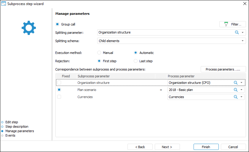 If the Group Call checkbox is selected, at least one process parameter can be linked to the specified subprocess division parameter in the Correspondence Between Data Subprocess and Process Parameters area.