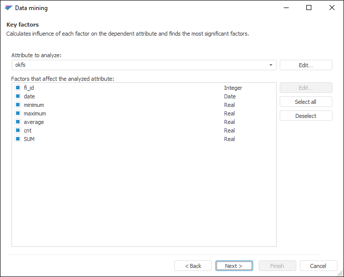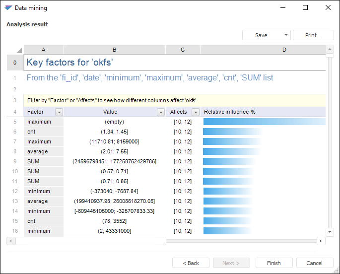 This type of analysis calculates a degree of influence of each factor on the dependent attribute and detects the most significant factors.