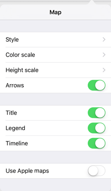 Foresight Analytics Platform maps and Apple maps can be used. The following map parameters can be determined by values of the elements selected in metrics dimension: