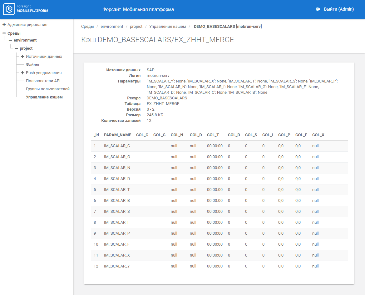 Above the list of caches by parameters, there is information about data source, account, resource, and the number of contained caches by resources.