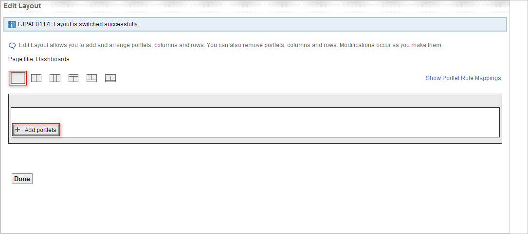 The Edit Layout dialog box opens. Select the One Column layout option and click the Add Portlets button: