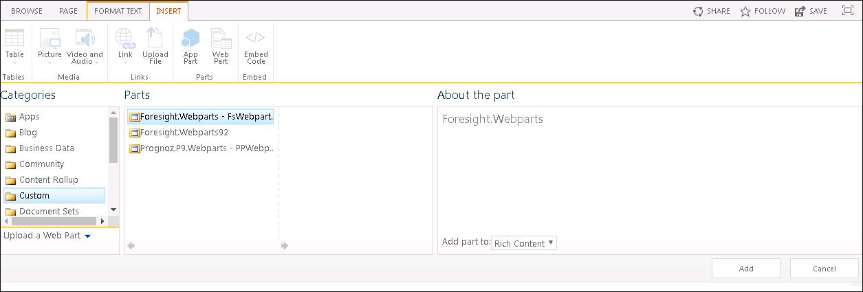 Before adding a web part make sure that the Foresight.Webparts.wsp solution is deployed and activated on Microsoft SharePoint portal.