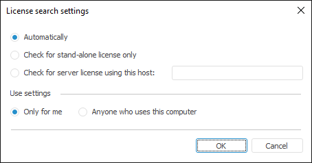 1. Determine license search settings in the License Search dialog box and select the Anyone Who Uses This Computer radio button, because BI server process may be started under different users. If the Only For Me radio button is selected, that may cause application activation issues when starting under different users.