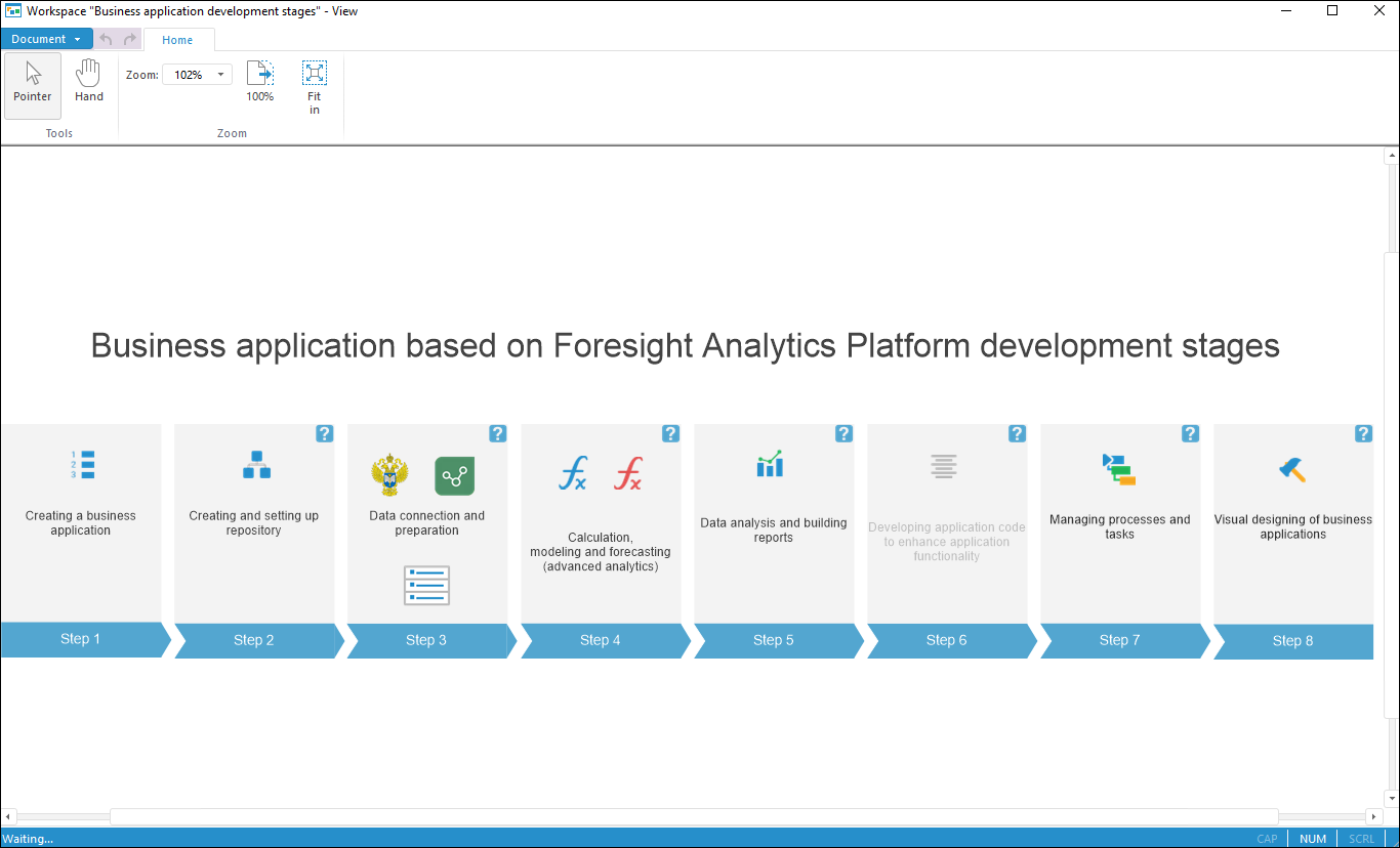 The demo example visually presents stages and steps required to execute the business case aimed at company's financial performance analysis, and to develop a business application.