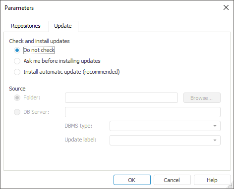 On the Update tab in the Parameters dialog box if the DB Server radio button is selected.