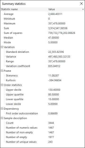 Statistics for the selected range will be displayed in the Summary Statistics dialog box: