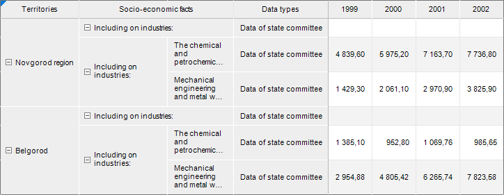 As an example, consider the Accounting Balance Indicators table, which contains three dimensions by rows: Registry of Organizations (elements of the first level), Accounting Balance Indicators (elements of the first and second levels), Accounting Data of Accounting Balance  (elements of zero level). Depending on the selected dimension, selected checkboxes of dimension merging and its combination, the table looks as follows: