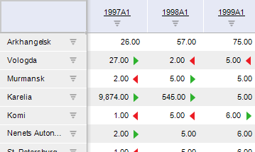 Growth indicators will be displayed in the table by rows or columns. Simultaneous displaying of growth indicators for rows and columns is not available.