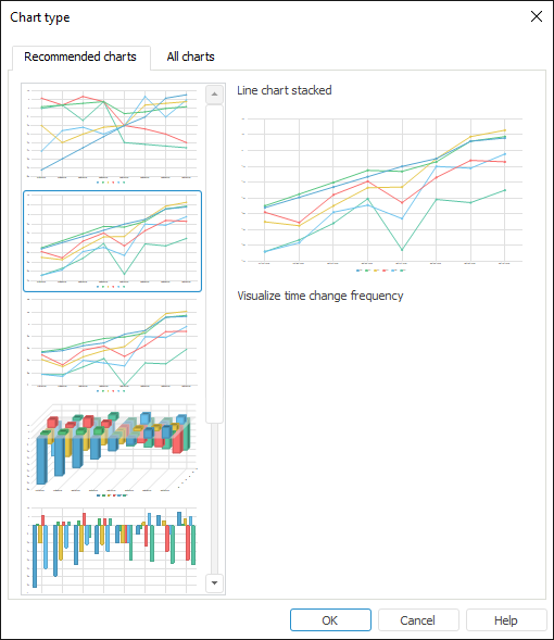 The Recommended Charts tab contains most appropriate chart types for selected data. The appropriate charts are selected based on the source data, available dimensions and selection in them.