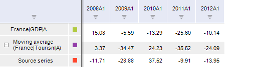After the method is applied, in the workbook, based on each selected series a calculated series with a name of the Moving Average (<Series_Name>) type is created, containing the calculation results. For example: