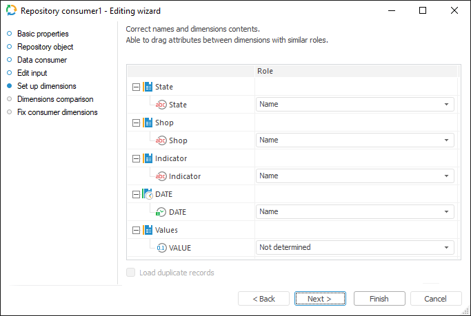 To link dimension with existing dictionary, select dictionary in the drop-down list next to required dimension. The following items are available for selection: