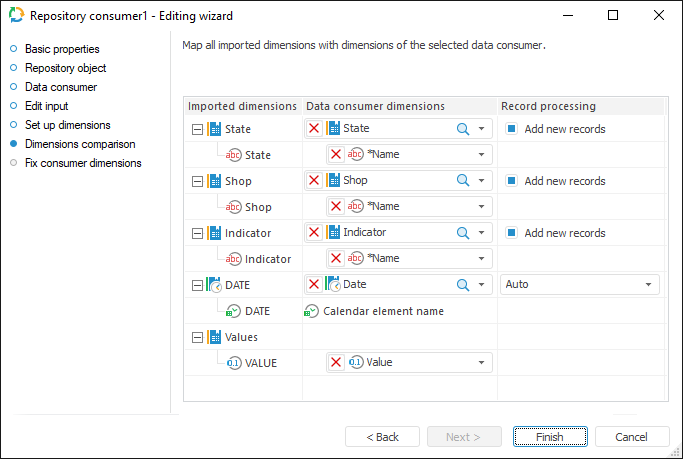 To link imported dimensions with existing repository dictionaries, use the Dimensions Comparison page.