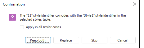 If identifier of the exported style matches the identifier of style in the styles table, the following message appears for the user to select the required method:
