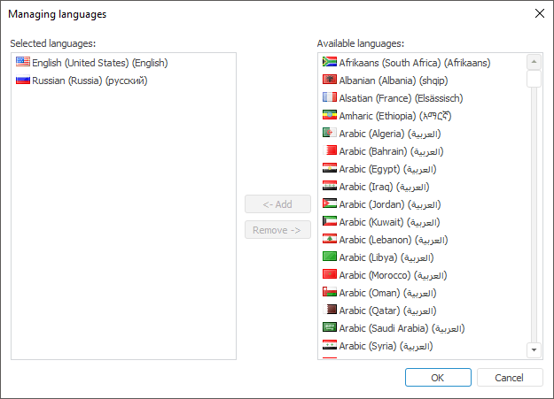 Add a new translation language using the Managing Languages button. The Managing Languages dialog box opens:
