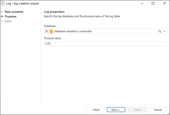 Properties. Specifies the database where the log must be created as well as physical name of the table, which must correspond to the repository log.