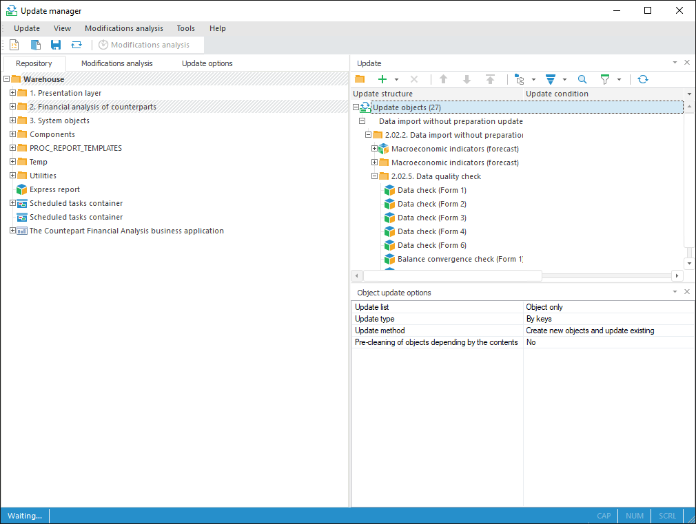 To synchronize objects between repositories and their updates, use the Update Manager tool: