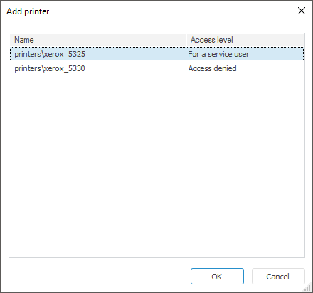 Add or change access level for printers. If the list of available printers is empty, all printers specified in the policy editor that are available for the user are displayed.