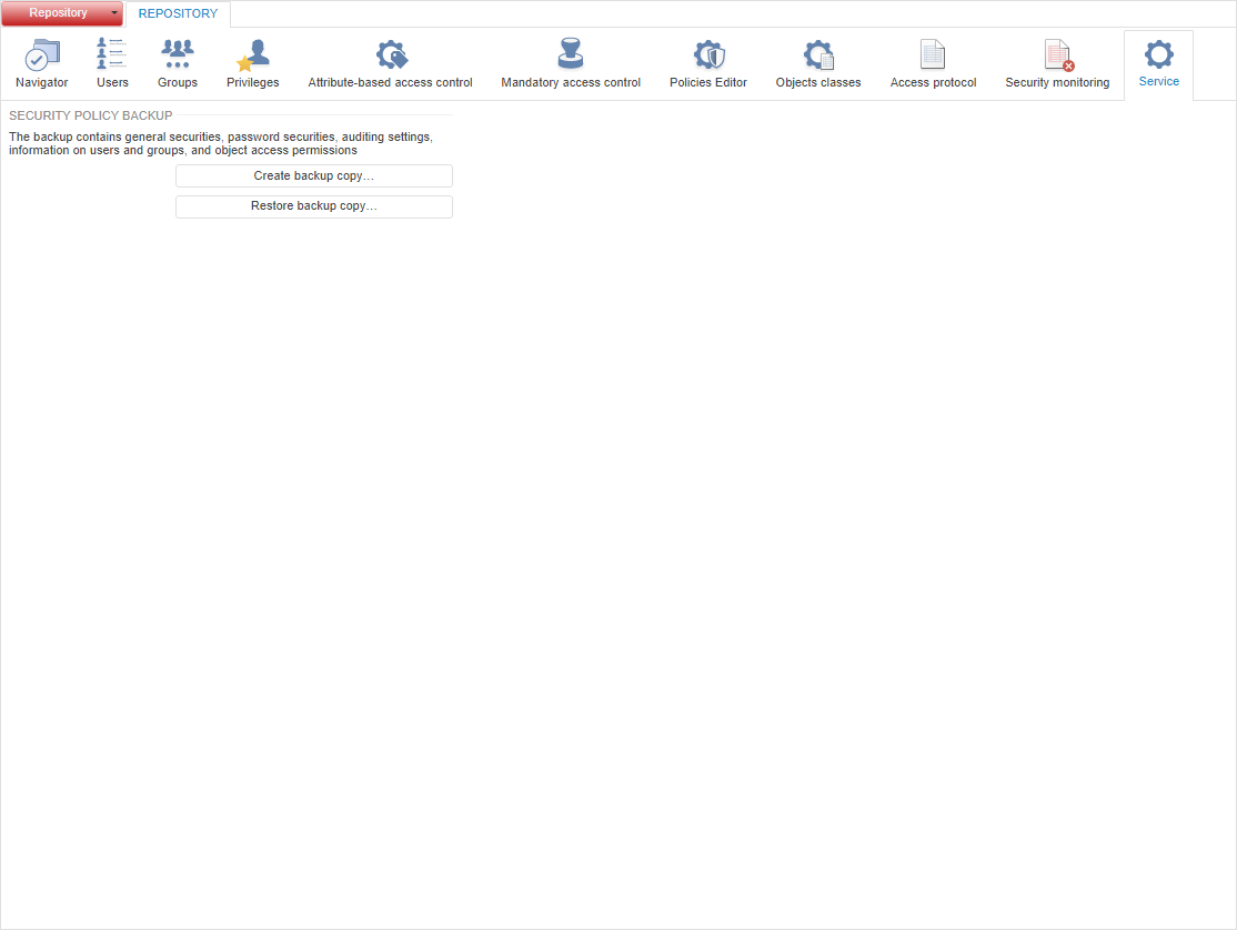 NOTE. Backup and restoring security policy is executed within one repository without possibility to create it in another repository. Security policy is restored, if the current version and restored version do not match.