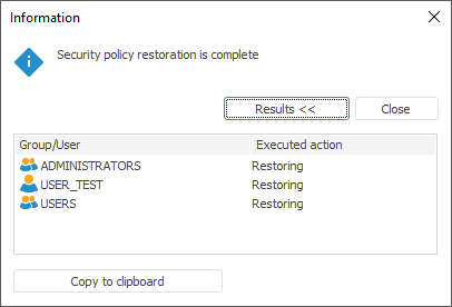 After restoring information security policy the system requests to update user list. User update is required to ensure correct performance in the future. If the answer is positive, user update is started. After the process is completed a message appears informing that security policy is restored: