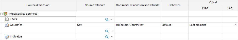 TIP. Use the first element offset or the last element offset to specify that you want to use only one element from multiple elements obtained by the link. For example, multiple child elements are obtained for each element by the link X.KEY = X.PARENT_KEY. To avoid aggregation of these values and simply take value of the penultimate element, select the Last Element value in the Type column and specify the -1 value in the Lag column.