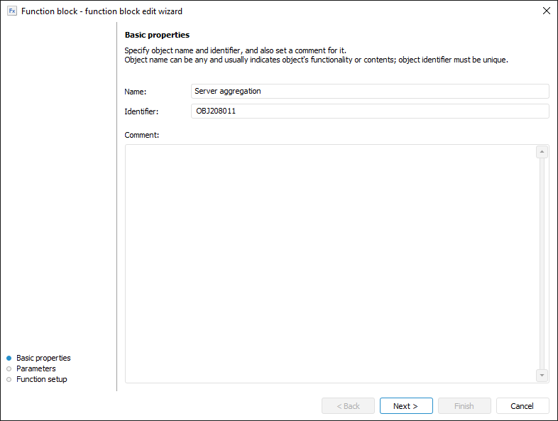 Basic properties of function block can be set up on the Basic Properties page in the function block editing wizard: